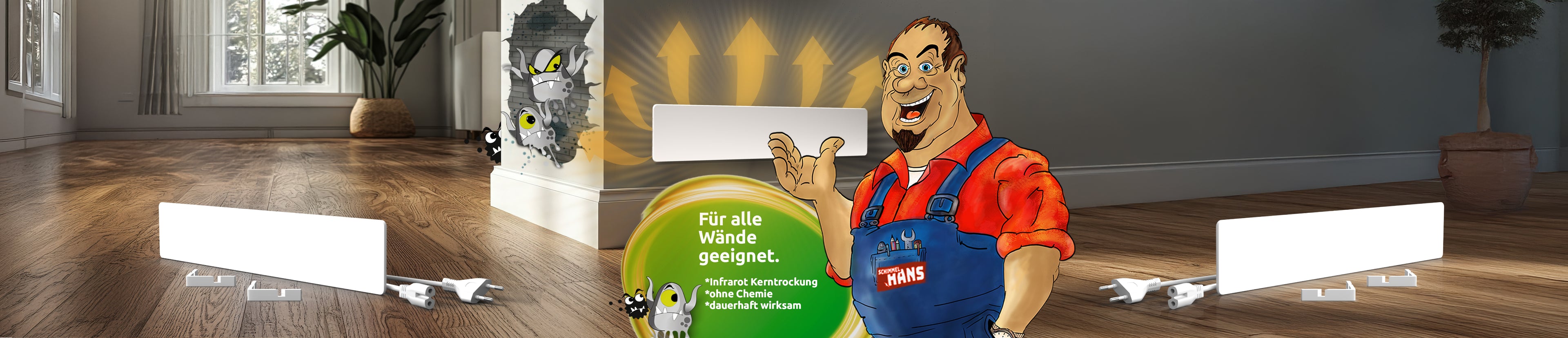 Die Infrarotstrahlen erwärmen den Mauerkern und bekämpfen den Schimmel gezielt und nachhaltig. Diese Methode trocknet die Wände vollständig aus und verhindert somit neues Schimmelwachstum. Trockene Wand – Schimmel verbannt.